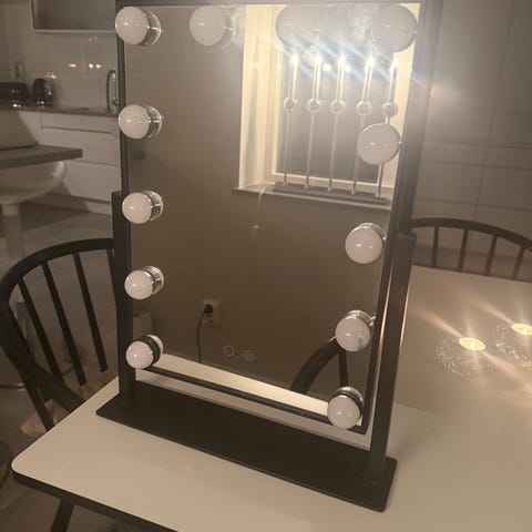 Sminkbord Spegel med belysning. Vit ram med flera lampor runt spegeln. Kan monteras på vägg eller placeras på bord. Designad för att ge bra belysning vid sminkning eller personlig vård.