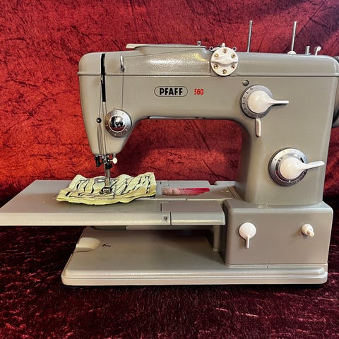 Singer symaskin monterad på ett träbord med metallram och fotpedal. Maskinen är svart med guldfärgade detaljer och har en robust konstruktion. Passar för sömnadsarbete och reparationer. Konverterat till 220v av professionell elektrikern. Finns i Vrena