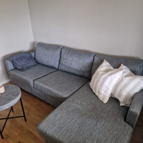 Hörnsoffa med grått tyg