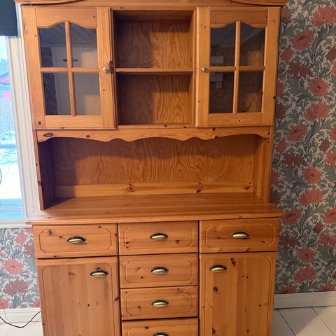 Träskåp med två glasdörrar upptill, hyllplan och två lådor. Skåpet har även två dörrar nedtill för förvaring. Passar för användning i kök eller matsal.