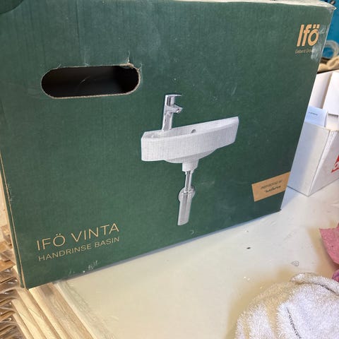 Westerbergs runt handfat, vitt, 40 cm i diameter tillverkat i keramik. Blandaren är av märket Mora. Är monterat på en massiv skiva 27 mm tjock och 70 x 63 cm. Finns nära Henån på Orust. Hämtas där.
