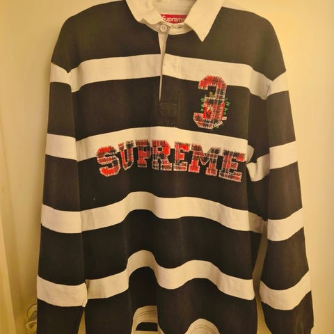 Tröjan har broderade chenille-bokstäver i olika färger över fram- och baksida samt på ärmen. Bra begagnat skick.