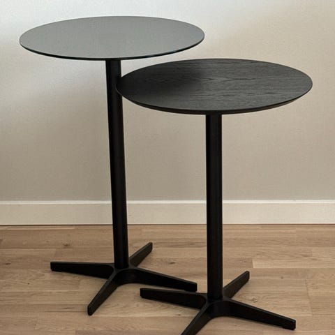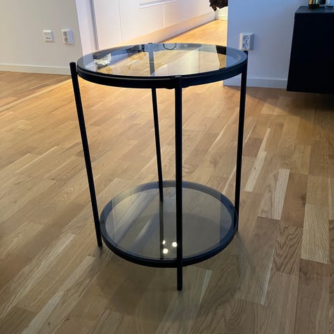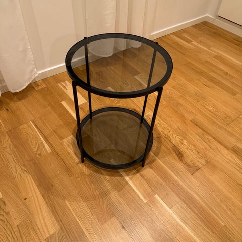 Säljer ett nästan helt nytt sidobord med svarta metallben och svarta glasskivor. Säljes billigt pga flytt.
