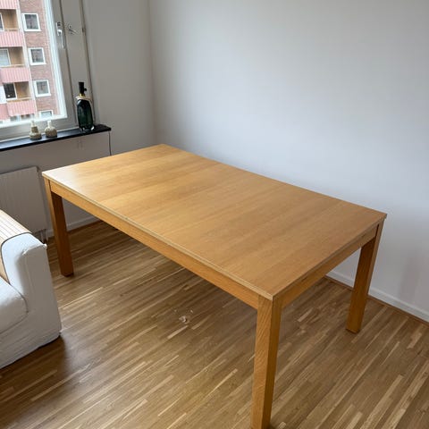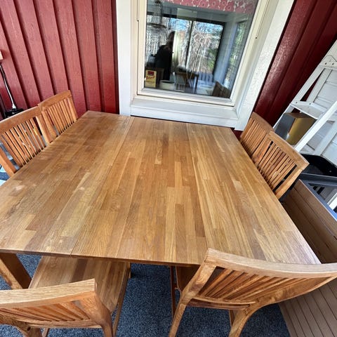 Köksbord och 6 stolar i ek, stolarna har även stoppad sits . Det följer även med 3st extra skivor (40cm varje skiva) . Bordet har en längd på 1.60m och med samtliga skivorna monterade blir bordet 2.20m