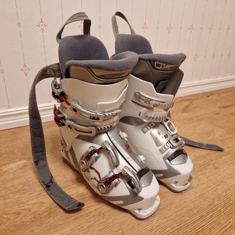 Sköna pjäxor men nu urväxta. Ena pjäxan saknar övre spännbandet, men min son som använt dem har inte saknat det dock. Innermått 25.5, yttermått 295 mm.