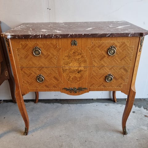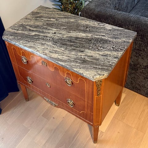 Gustaviansk byrå med marmorskiva som är avtagbar. Möbeln har två lådor med mässingsbeslag och dekorativa ben. Passar för förvaring i olika rum.