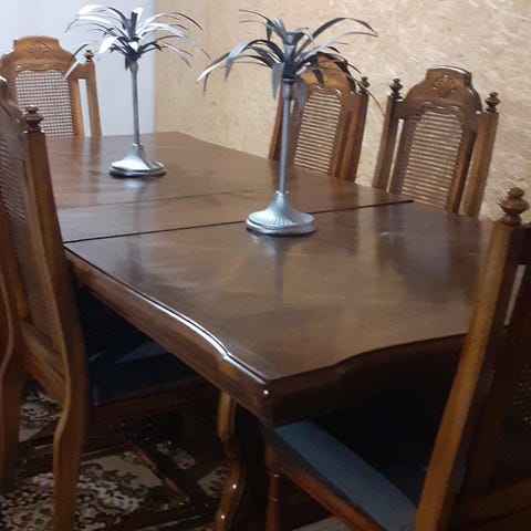 Matsalsbord med 6 stolar (4 av samma sort, två av en annan sort)
