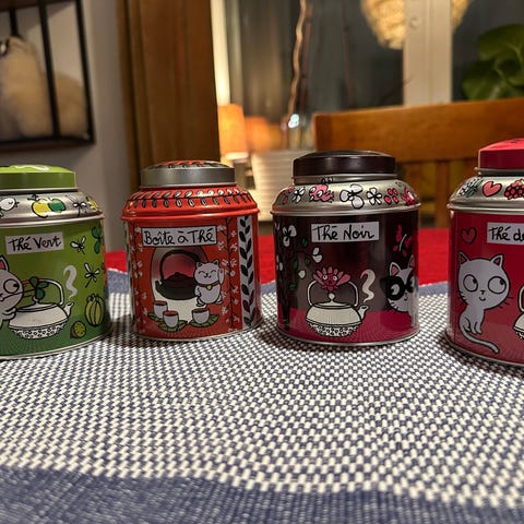 Diverse te och kaffeburkar i olika storlek och motiv - fyller en mindre IKEA flyttlåda.