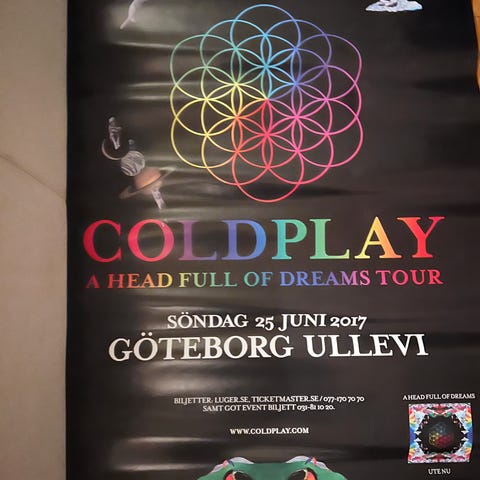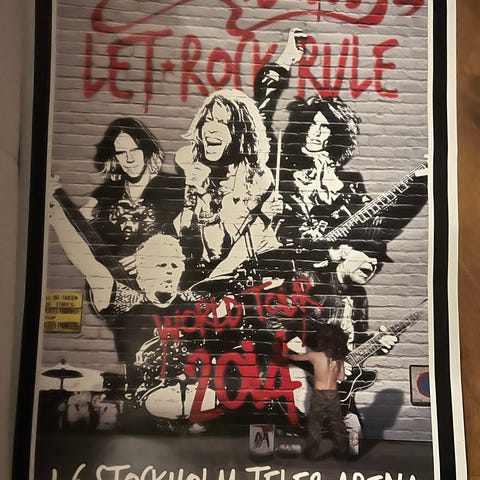 Samling av konsertaffischer från Rolling Stones turné 2022, R Stones Friends Arena, Red Hot Chili Peppers Herning Danmark och Ericsson Globe samt affisch reklam för Albumet The Getaway, Lady Gaga Ericsson Globe the Artpop ball tour samt Friends Arena the Chrimatica ball tour. Affischerna visar turnédatum och specialgäster, tryckta i olika storlekar och färger.