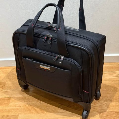 Resväskan har flera fack och dragkedjor för organiserad förvaring och är utrustad med hjul och teleskophandtag för enkel transport.