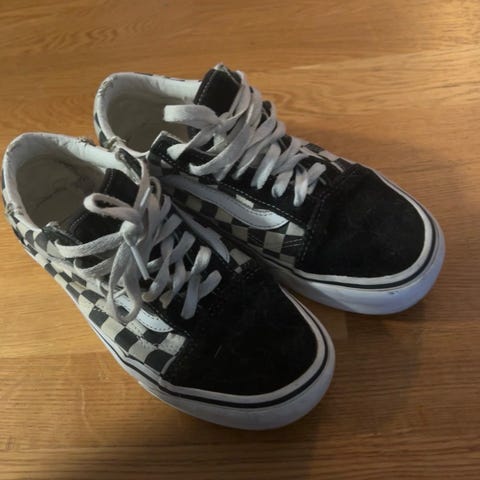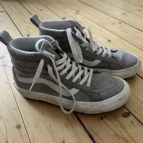 Vans Authentic i storlek 38 med grågrön färg. Skorna har snörning med bruna läderskosnören.