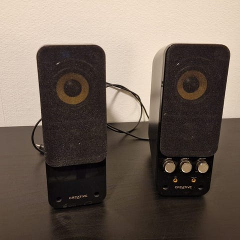 Säljer nu mitt gamla 2:1 högtalarsystem från Creative! Ljudet är lika skarpt som dag 1, men det finns lite synliga repor, samt att volymvredet inte är i toppskick längre.