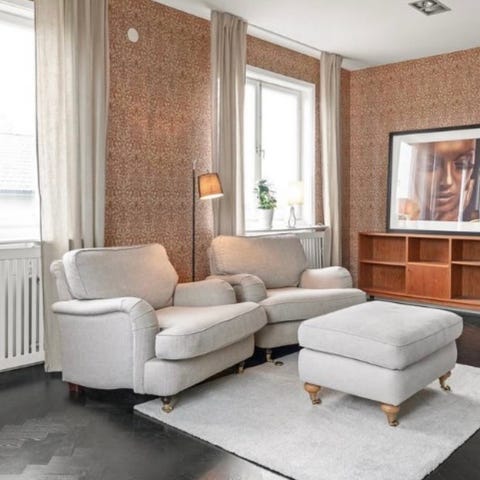 Tjock stoppning och fina trä ben fram med mässing. Mindre fläck på den ena som jag tror man kan ta bort enkelt (se bild)