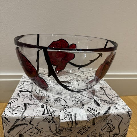 Kosta Boda Tattoo vas designad av Ludvig Löfgren. Vas i klart glas med röd dekor i form av blommor. Höjd 225 mm, diameter 140 mm.