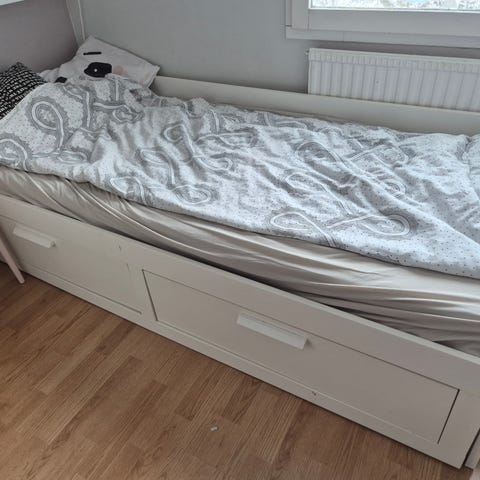 En ikea malm säng 90x200 hög med 2 utdragbara förvaringslådor under.