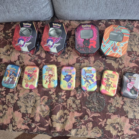 Pokémon och Skylanders samling av plåtaskar med olika motiv från Pokémon Trading Card Game.