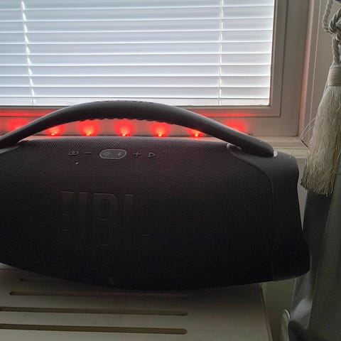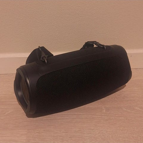 JBL Boombox bärbar högtalare med svart färg. Produkten är avsedd för bärbar användning och har en robust design. Upp till 24tim speltid påen laddning
