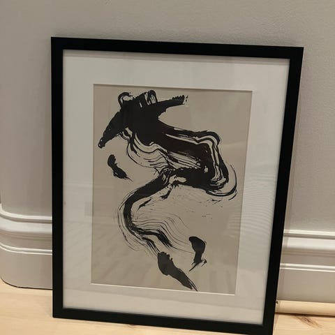 Konsttryck med abstrakt motiv i svartvitt, inramad och klar för upphängning. Passar för inredning i olika miljöer.