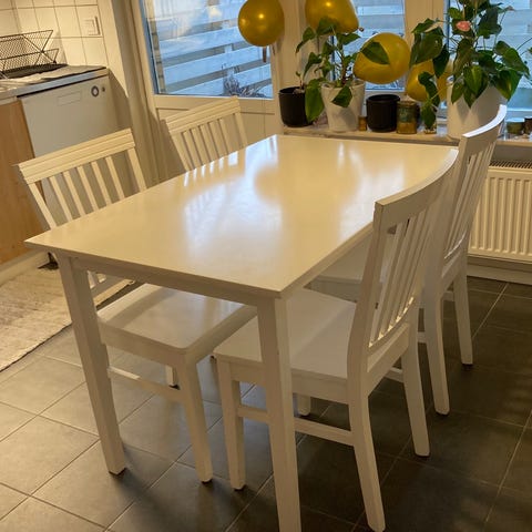 IKEA Ekedalen högre köksbord och fyra stolar enligt bilden. Dynornas tyg är avtagbara och tvättbara. Se mått på bilderna.
