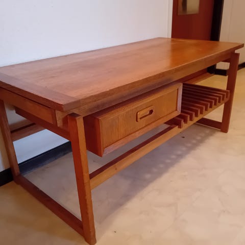 Hyllor med 2 lådor. Retro, från mitten av 1900- talet. Teak. Finns 2 likadana hyllor. Den ena är ok, den andra är något skavd på ovansidan av lådorna. Hyllorna står löst ovanpå lådorna.