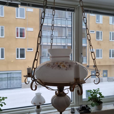 Antik mässingslampa taklampa med sex armar. Lampan har en klassisk design i mässingsmaterial och är avsedd för takmontering. Passar för användning i rum där en traditionell belysningsstil önskas. Den mindre är jättetung 30 cm hög o 60 i diameter har ej testat elektroniken sedan den böev nedmontering.