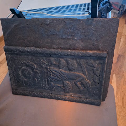 Antik sättugnsplatta Bakkevaags Værk i gjutjärn med motiv av ett vikingaskepp och dekorativa detaljer. Plattan är och har en rektangulär form med texten 'Bakkevaags Værk' ingraverad. Passar som dekorativ väggplatta eller samlarobjekt. Höjd 40 cm Bredd 50 cm Obs ! Skickas ej