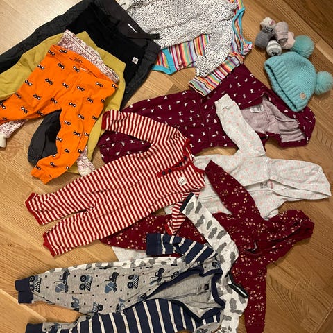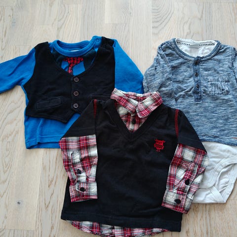 Barnkläder i storlek 74 inklusive flera t-shirts i olika färger samt ett par mörkblå shorts.