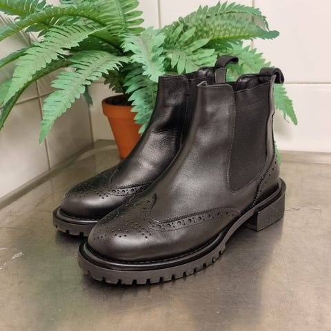 Sköna fodrade korta svarta läderkängor. Stl 38. Höjd 15,5cm, klack 4cm