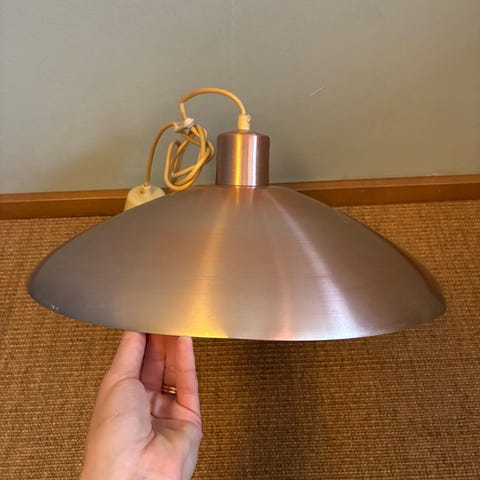 Jättefin taklampa som skärmar av ljuset så den fungerar att ha över matbord. Har fått några repor och saknar stickkontakt för tak (el intakt). Mått: cirka 42 cm på bredaste stället i diameter. Höjd:34 cm