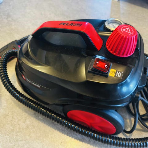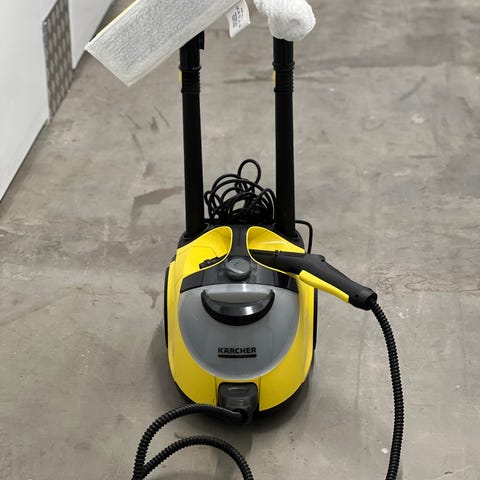 Kärcher ångtvätt med handtag och sladd för rengöring. Färgen är gul och materialet är plast och metall.