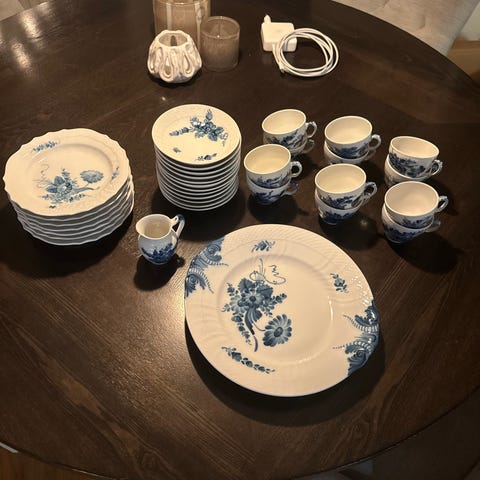 Royal Copenhagen kaffekoppar och fat i porslin med dekorativa mönster i bruna toner. Setet innehåller flera koppar och tillhörande fat, lämpliga för servering av kaffe.