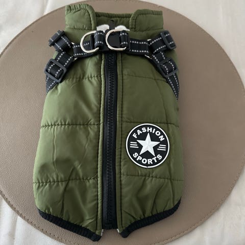 Täcket är designat för att hålla hunden varm och skyddad. Materialet är slitstarkt och anpassat för utomhusbruk.
