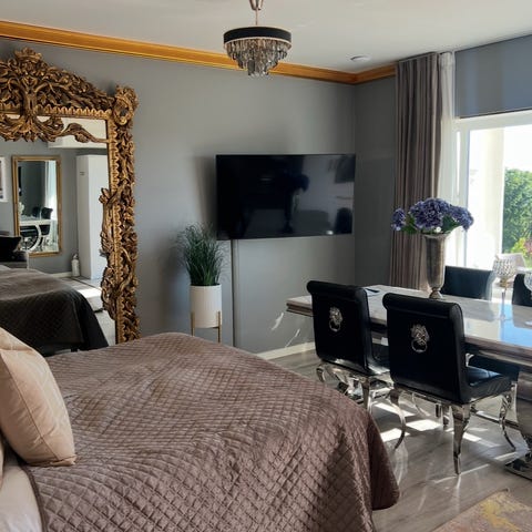 Matbord i marmor + stolar + avlastningsbord