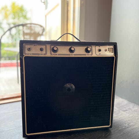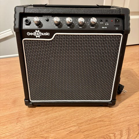 Gitarrtillbehör i form av en gitarrförstärkare med svart färg. Förstärkaren har reglage för gain, boost, volym, diskant (treble), mellanregister (middle) och bas, samt en på/av-knapp.