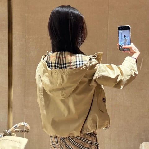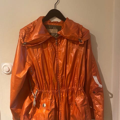 Jackan är designad för dam och har ett klassiskt mönster på insidan. Den är utrustad med knappar och dragkedja samt ett bälte i midjan för justerbar passform. Den är oanvänd helt nu och dyr inköp.