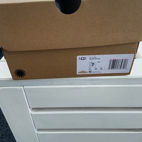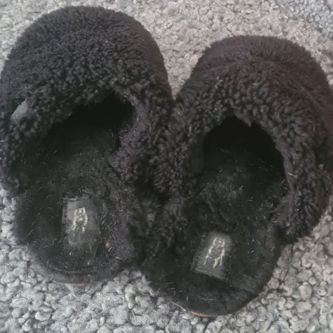 UGG tofflor i storlek 37. Skorna har en brun färg och en sula med mönster för grepp. Insidan är fodrad för komfort.