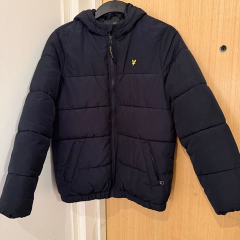 Svart jacka i storlek 10–11 år. Huva, dragkedja och knappar framtill samt två fickor. Fint använt skick, mindre fläck på ena ärmen (se bild).