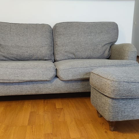 Soffa, fåtölj, fotpall och vitrinskåp