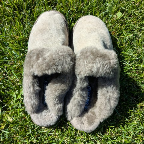 Kornblå fårskinnstofflor med grått fårskinn. Storlek ca 39. Sparsamt använda.
