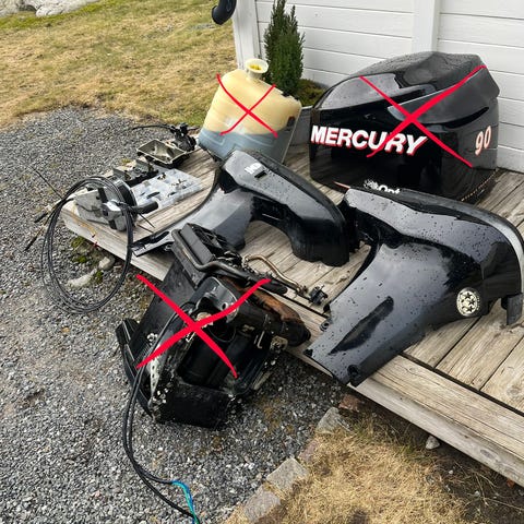 90 hk raksexa från början på 80 talet. Trim/tilt komplett med reglage användes fram tills att den tappade gnistan på tre cylindrar. Felsökt och kommit fram till att statorn är kass. 7500:-