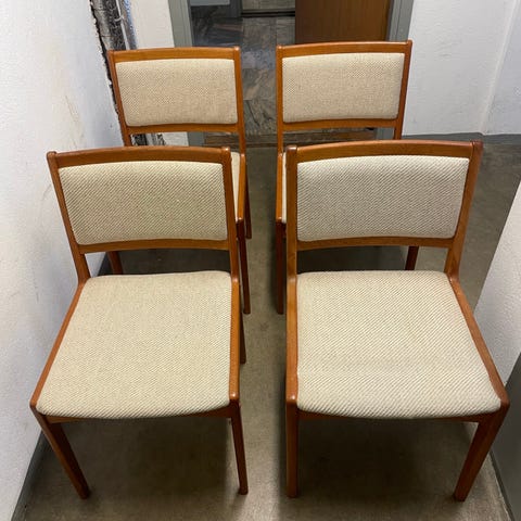 Fyra matstolar i massiv teak från Danmark. 1960-tal. Gott renoverat skick. Alla stolar har klätts om i ett mörkgrönt möbeltyg med ny stoppning.