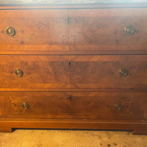 Faner med mahogny. Tre lådor och lös kalkstensskiva samt mässingsbeslag och lister. Fothylsor.