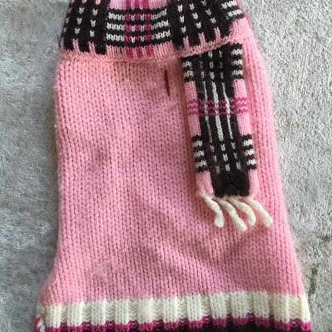 Hundtröja med rött, blått och vitt randigt mönster. Tröjan har röda muddar vid ärmar och hals, samt öppning för huvudet. Passar för små hundar.