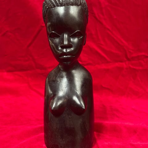 Dekorativ figurin i svart färg. Denna föreställer en kvinna i sittande position med händerna bakom huvudet. Detaljer i rött och vitt. Är nog från 50 - 60 talet, ca 20 cm hög