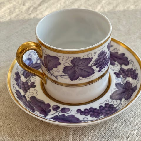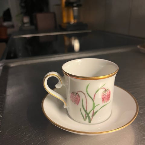 Kaffekoppar med fat i porslin med blomsterdekor och guldkant
