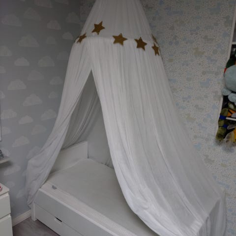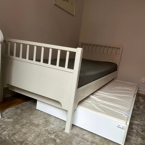 Köpt på Trendrum år 2020. Bra använt skick. Några av spjälorna i extrasängen har lossnat men går att lägga på plats.