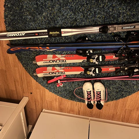 Bindningarna som sitter på skidorna på bilderna är sålda så sänker priset för skidorna till 35 kr.