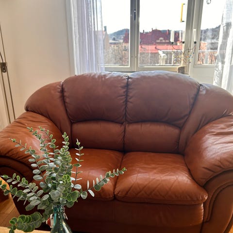 Svart soffa i äkta skinn. Inköpt på Törnwalls möbler. Mycket bekväm med hög rygg. Använd men i fint skick.