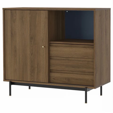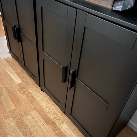 IKEA förvaringsskåp med dörrar i mörkgrå färg och vita ben. Är i två sektioner. Den ena är 80 cm bred och den andra 60 cm bred. Går att ha var för sig eller ihop. Passar för förvaring i olika rum.