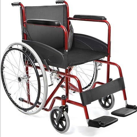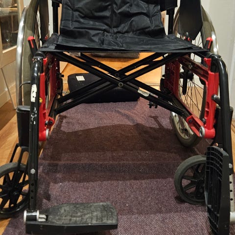 Rea Spirea rullstol i svart färg med vadderad sits och ryggstöd. Utrustad med armstöd och fotstöd. Rullstolen har stora bakhjul och mindre framhjul för manuell framdrivning. Passar för användare som behöver hjälp med mobilitet.